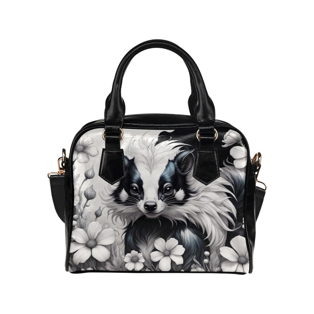 This adorable purse is the perfect accessory for any woman who loves nature and forest animals. This beautiful shoulder bag features an illustration style fluffy skunk in black and white tones.