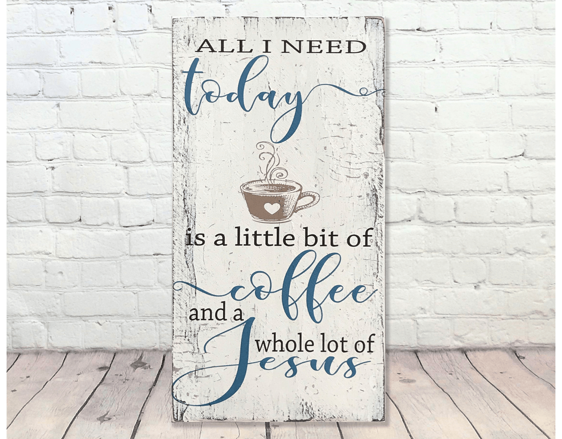 All I Need Today Is A Little Bit of Coffee and a Whole Lot of Jesus This vertical wood sign is the perfect start to your morning. Hang it above your coffee bar or on your kitchen wall