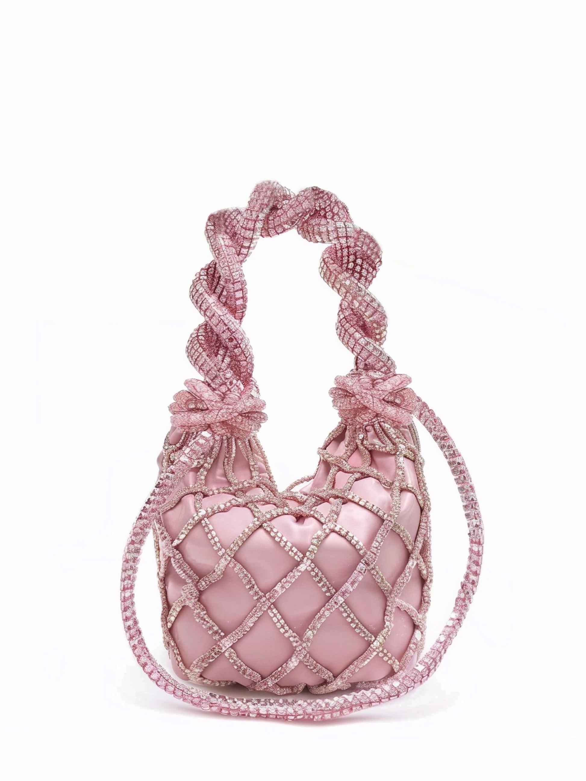 Artificial Crystal Diamond-Shaped Hollow Woven Bucket Bag - Pink