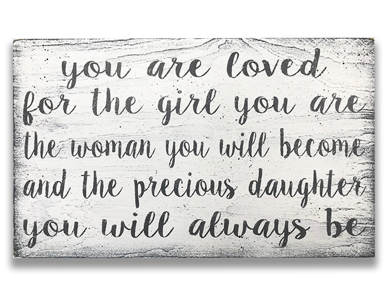 You Are Loved For The Girl You Are, The Woman You Will Become And The Precious Daughter You Will Always Be. We can't imagine any little girls room would be complete without this wall hanging!