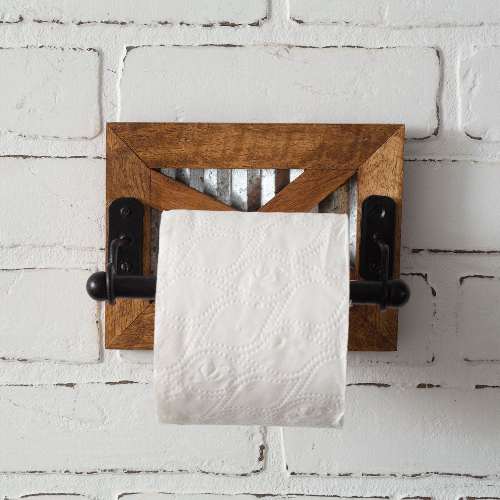 Hang our barn door toilet paper holder in your bathroom for a farmhouse look. It has a corrugated metal background and black metal hooks that hold a rod where the toilet paper will sit.