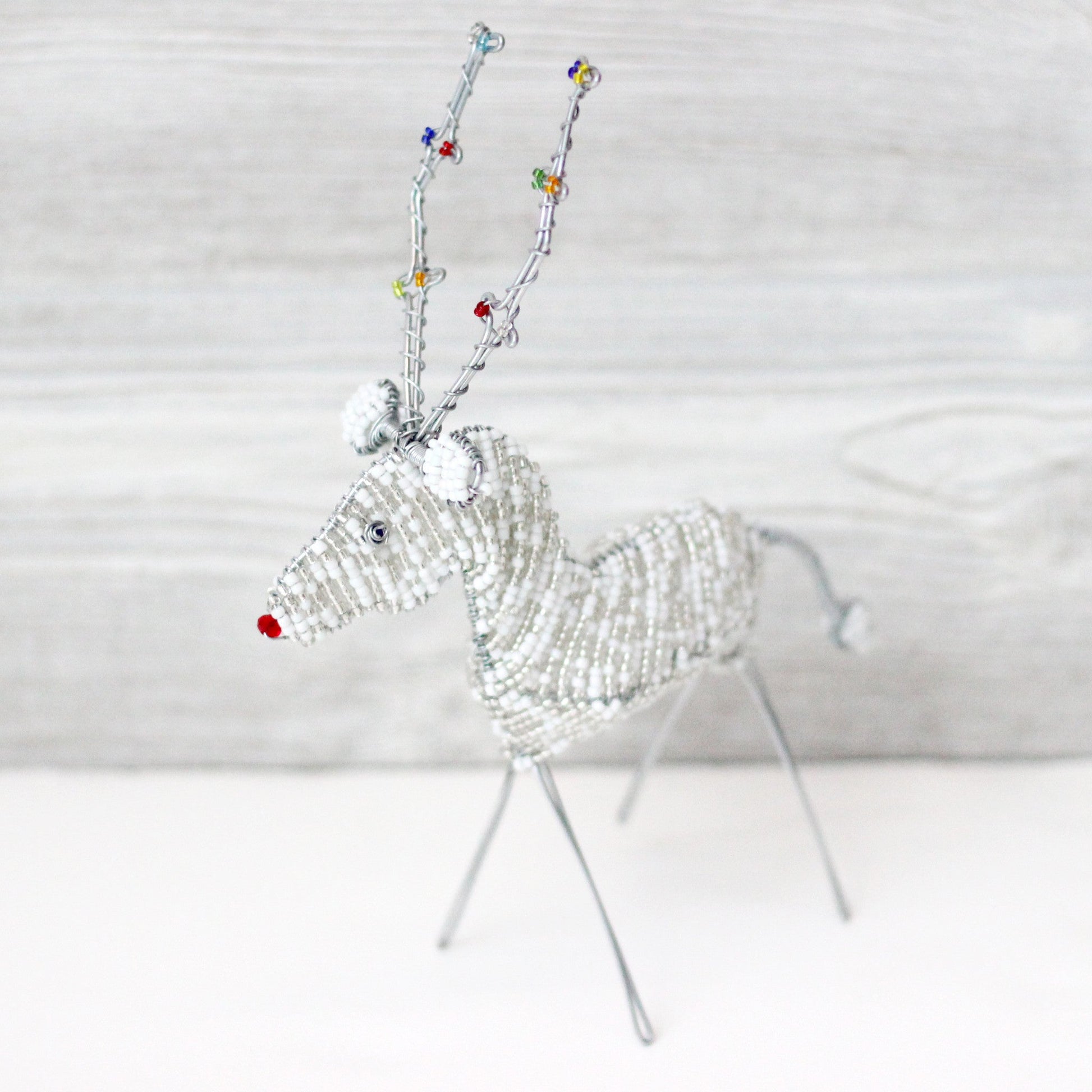 This adorable, beaded reindeer was handmade, bead-by-bead, by the Khutsala Artisans in Eswatini, Africa.