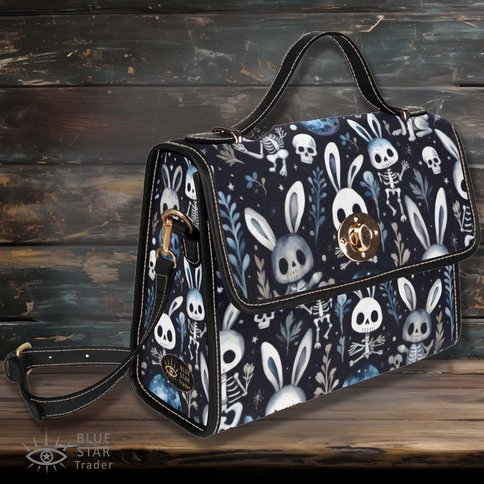 Black Blue Creepy Easter Handbag, Bunny Rabbit Goth Purse, Skulls Skeletons Canvas Satchel bag, Cross body purse, Vegan Purse, Halloween Get ready to turn heads and make a bold statement with this black, gray and blue cute creepy bunny rabbit purse.