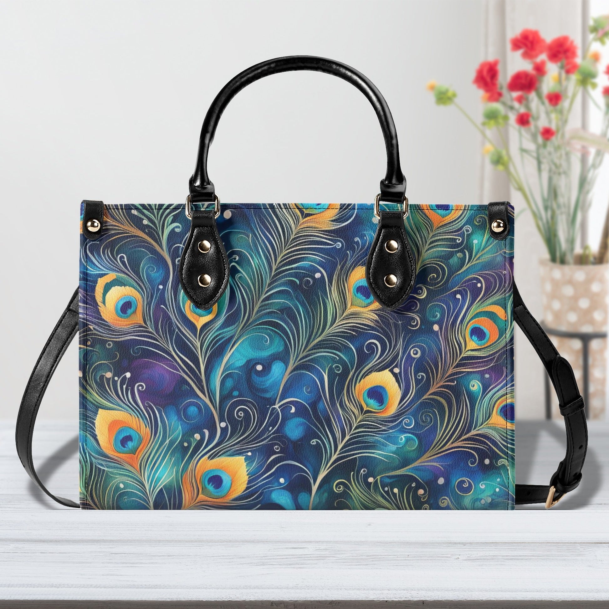 Blue Peacock Feathers Luxury Womens Vegan Leather Handbag