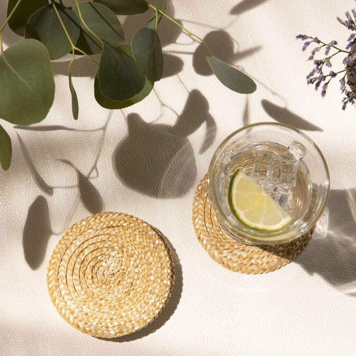 Natural straw coasters, handwoven in a circular pattern, create a casual warmth and richness for summertime sipping.