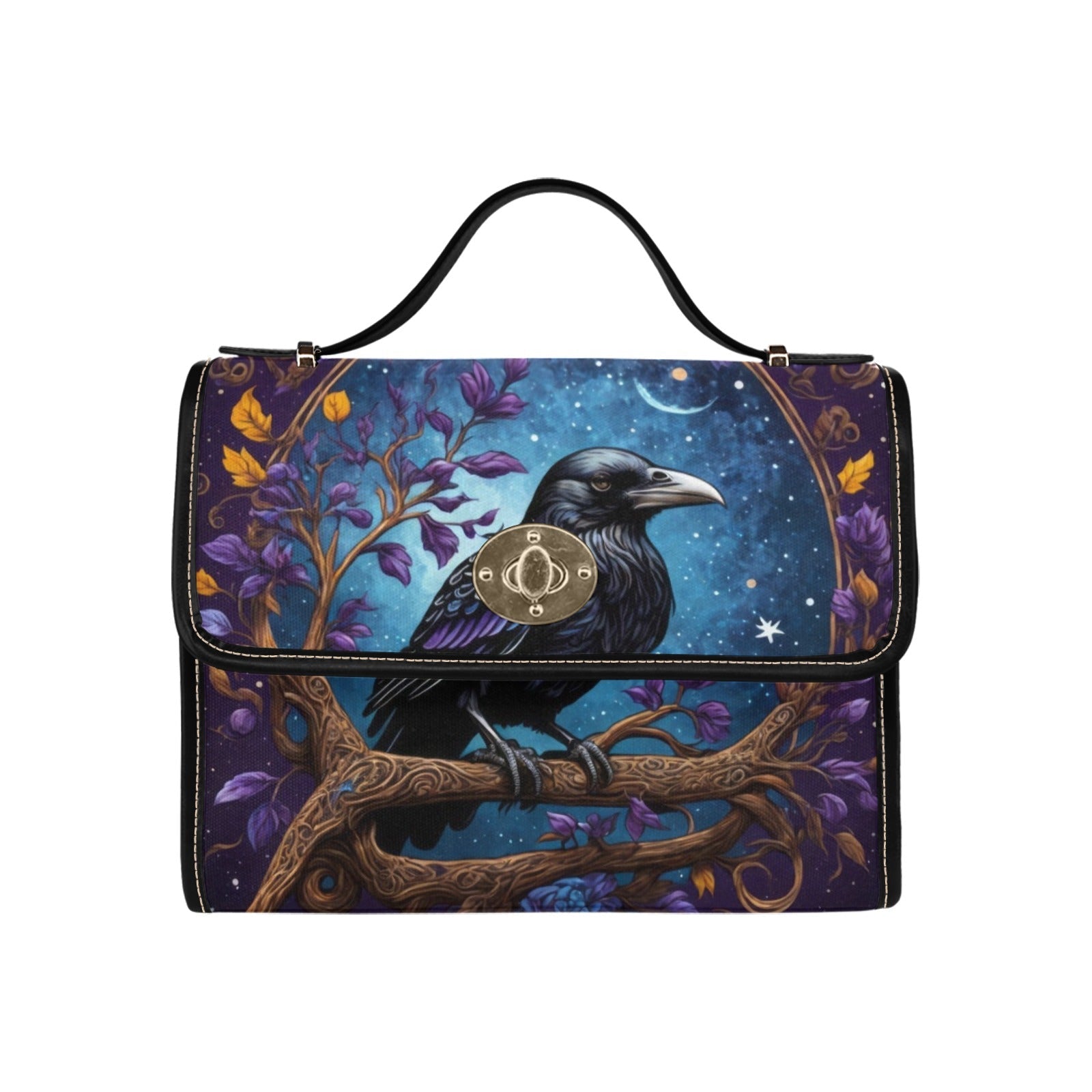 This one of our awesome original designs featuring a raven on a tree branch with a blue celestial night sky background and purple leaves bag. Awe your friends and acquaintances when you bring this bag to your lunch with friends or the office. Use it to carry books to class along with your personal items.