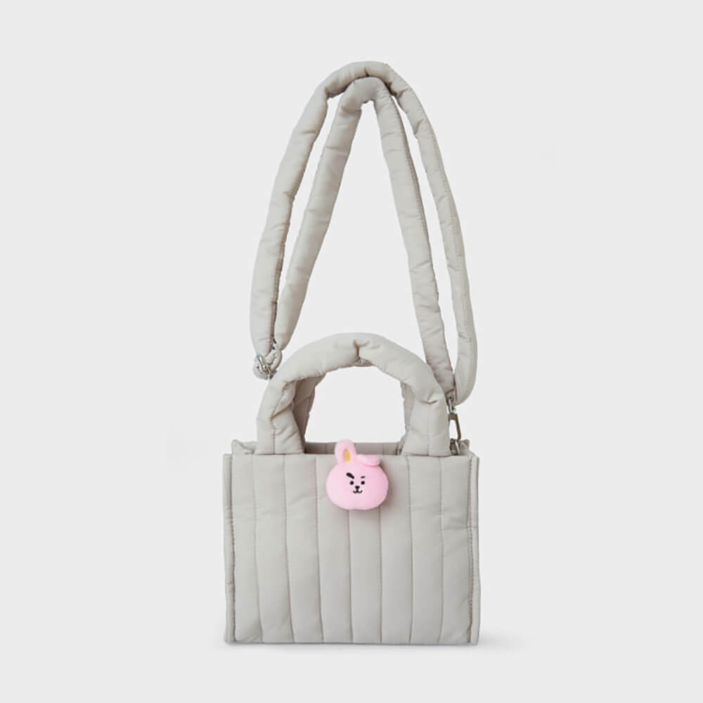 While we may appear small, we're surprisingly spacious. This bag showcases an adorable BT21 face plush charm as a detail, along with lightweight quilted fabric that won't weigh down your load. Ideal for carrying your essentials when you're on the move, its detachable shoulder strap enables versatile styling, easily transforming from a tote to a crossbody, giving you a two-way option.