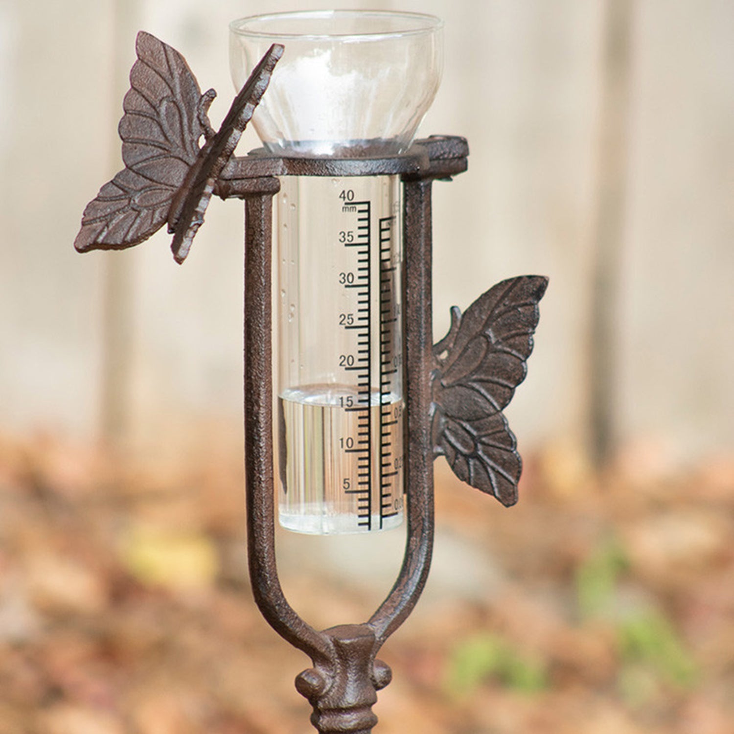 Collect the rain with this cast iron butterfly rain gauge yard stake. Two butterflies alight on the sides of this cast iron yard stake with a central glass container for measuring precipitation. Gift it to gardeners and amateur meteorologists.