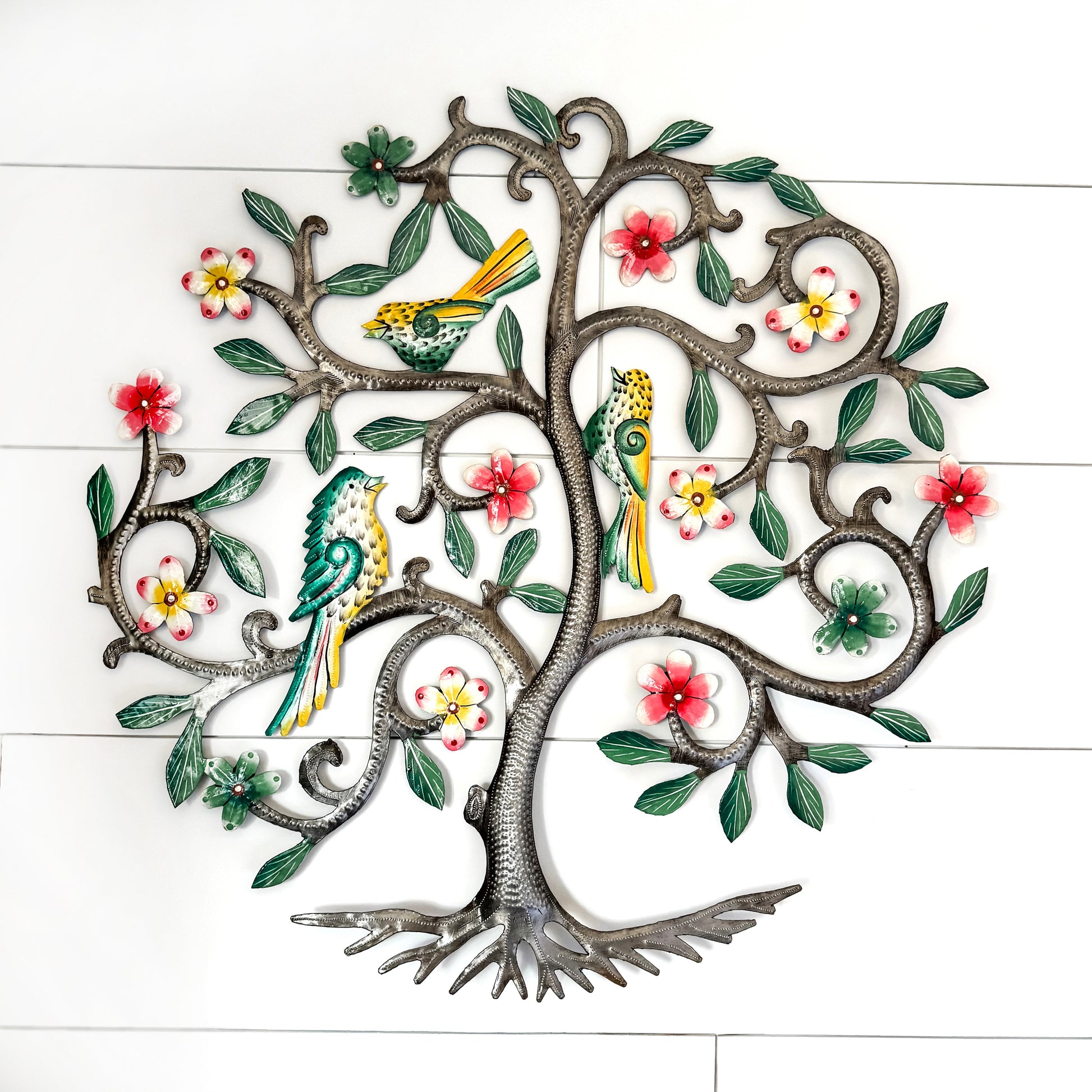 This unique art piece is handcrafted from recycled 55-gallon oil drums oil drums by artisans in Haiti. Expertly crafted, the Cherry Blossom Oil Drum Art will bring a touch of beauty to any home. Richly textured with vibrant colors, this piece is sure to be a beautiful focal point.