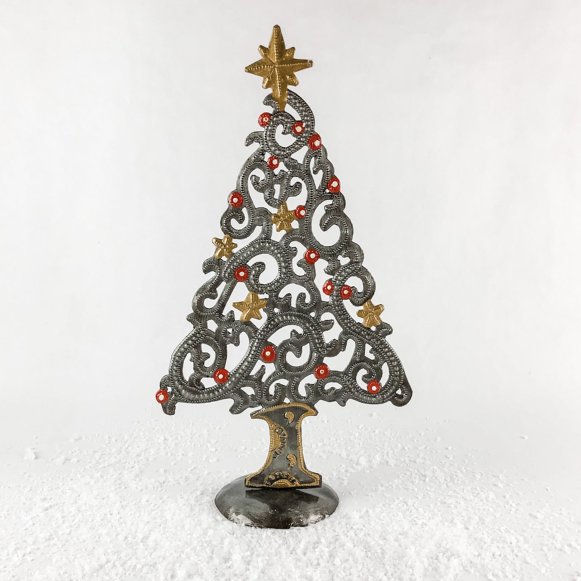 Your mantle will sparkle and celebrate the season with the addition of this handcrafted metal Christmas tree sculpture! This stunning piece of art is hand painted with gold and red highlights.