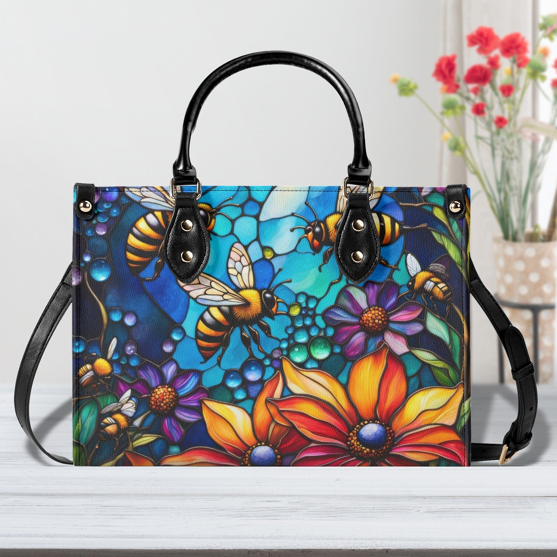 Colorful Bees Flowers Luxury Womens Vegan Leather Handbag