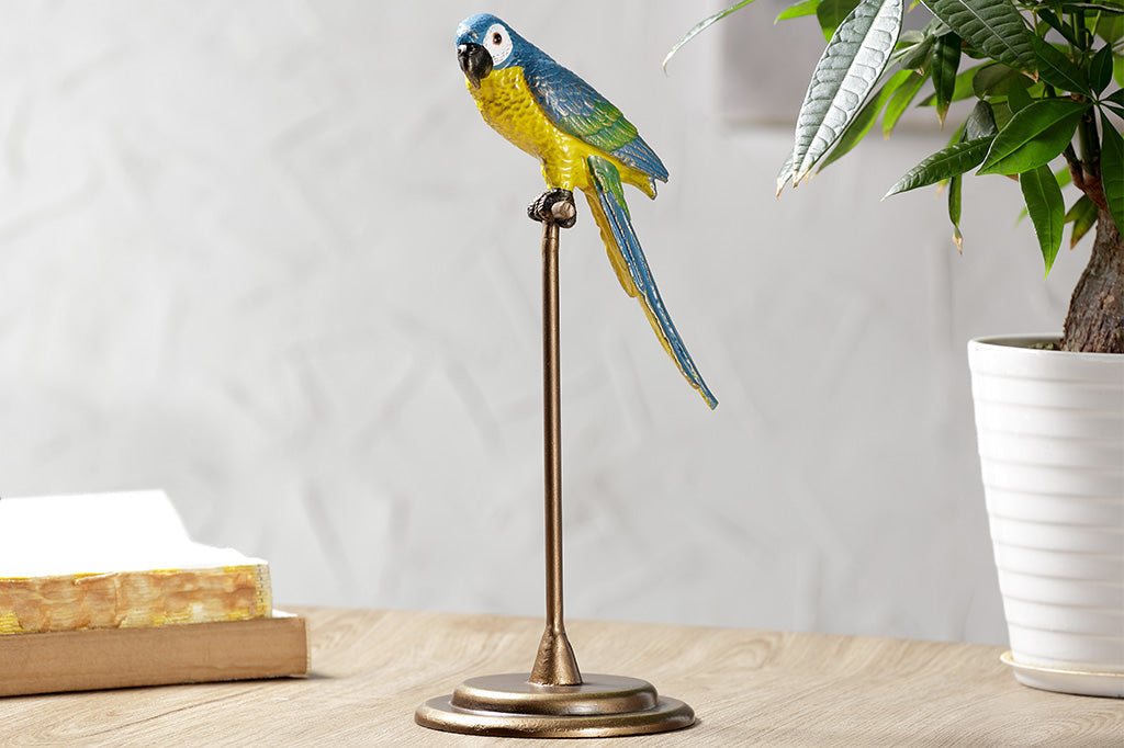 This blue, yellow, and green parrot sculpture adds a tropical touch to an interior. Pairs well with Ruffled Parrot Sculpture.