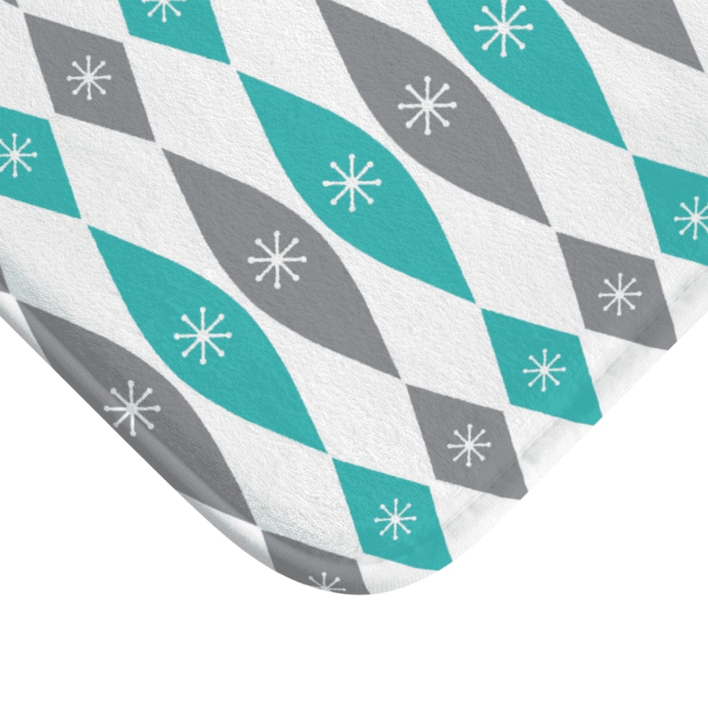 This high-definition turquoise and grey mid-century design on this absorbent, spongy bathmat exactly matches our Turquoise and Grey Shower Curtain design, to complete your bathroom's finished look.