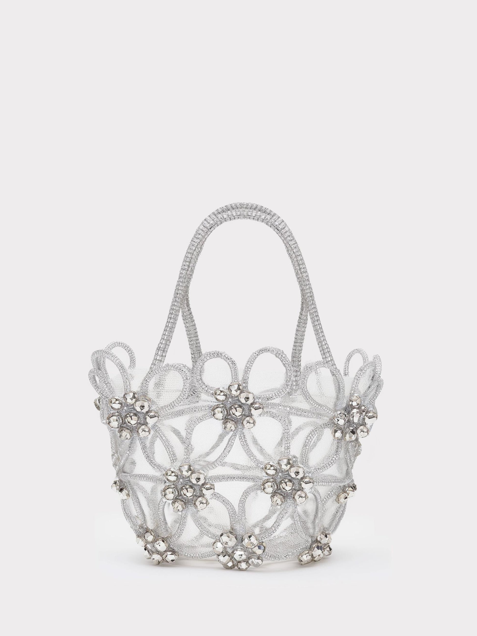 Faux Crystal Flower Woven Tote Bag - White