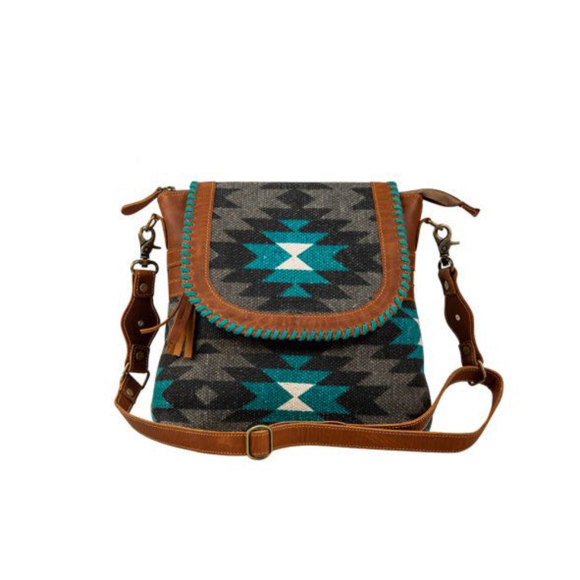 This gorgeous bag offers all the best from the Starfire collection from Myra Bags - gorgeous gray, black and turquoise colors in the upcycled woven rug, with leather accents in warm charcoal. Extra hand stitching around the top flap adds an extra special detail.