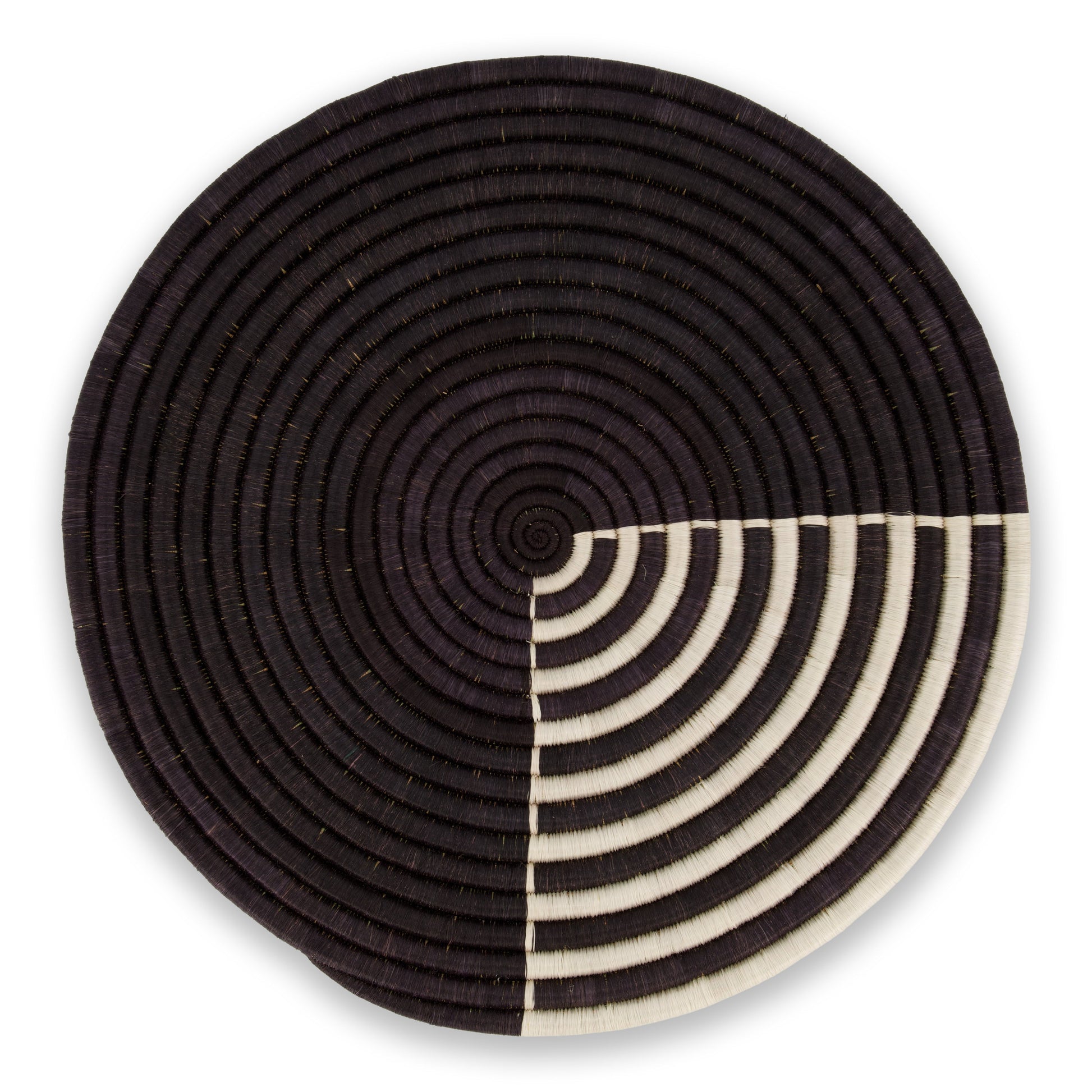 A striking contrast and radial pattern evoke meditation and elevated impact in this wall plate. These beautifully intricate wall plates are designed to enhance and magnify any room. Hang this expertly woven piece alone, or pair with other textures to create bold dimension. This stunning, lightweight piece is easy to hang or rest on any surface. Bring stirring visuals to your own gallery wall, or create a hypnotic focus by hanging solo. Each piece has hand-stitched hang loops on the back that allow for easy hanging in several orientations.