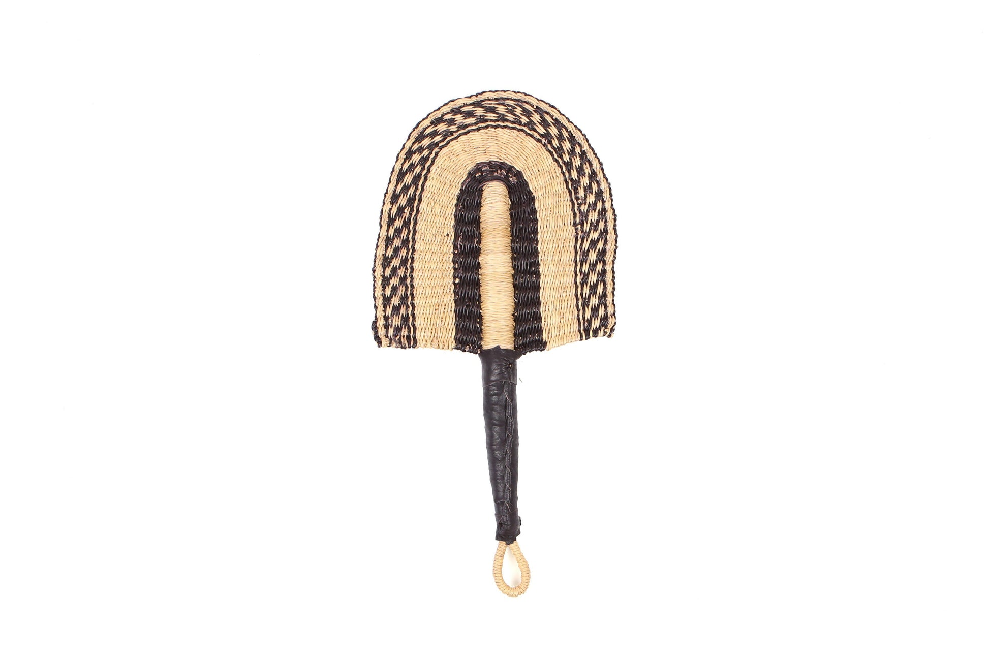 Style this small black checkered fan on a wall either alone for a minimalist look, or with other wall art for a dynamic look. Try it on a bookshelf to create a textured display. Includes a leather handle.