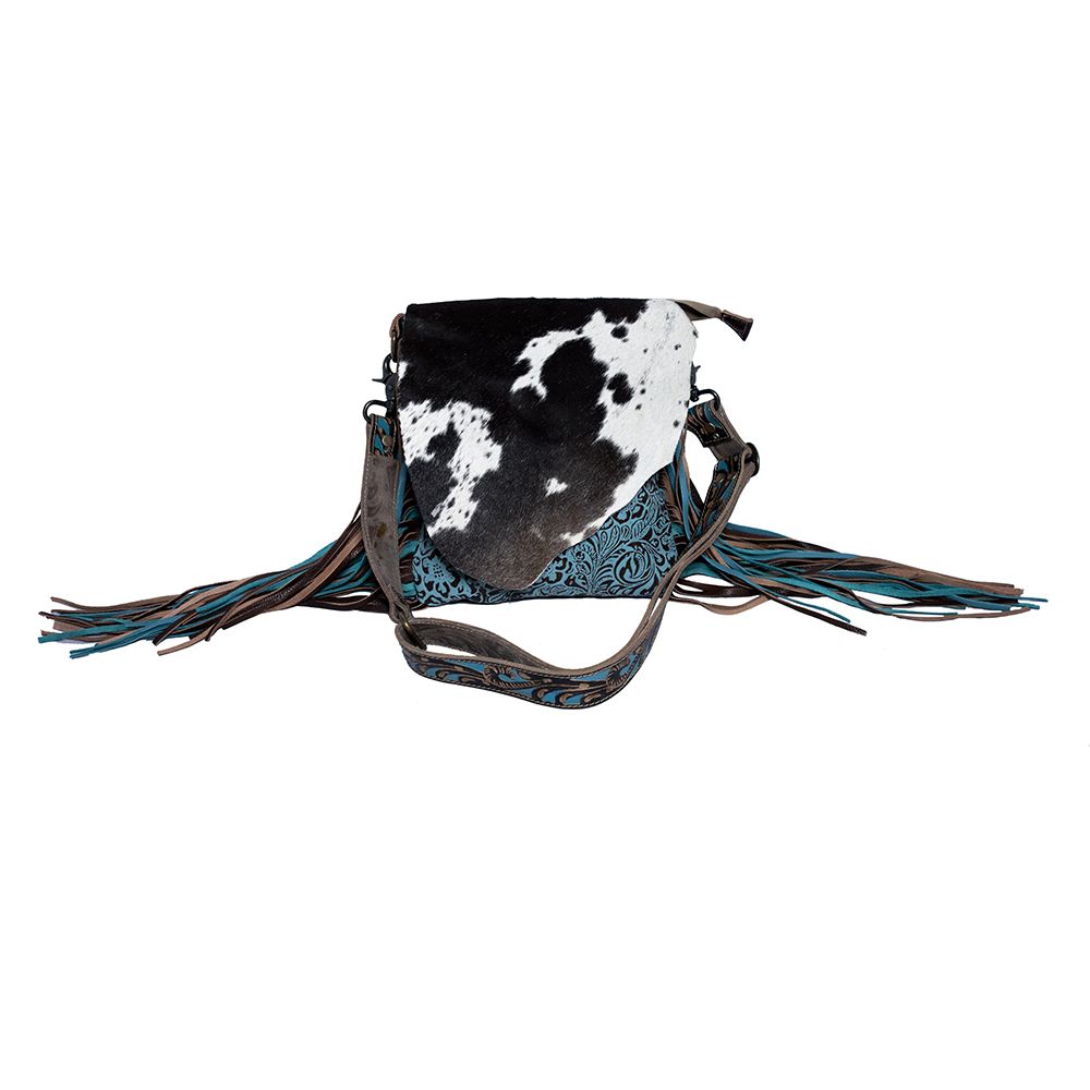 A conceal bag to carry your swag with utmost care. A perfect blend of embossed, hand-tooled leather and hair-on hide, it features an assymetrical front flap, adjustable shoulder strap and plenty of fringe!