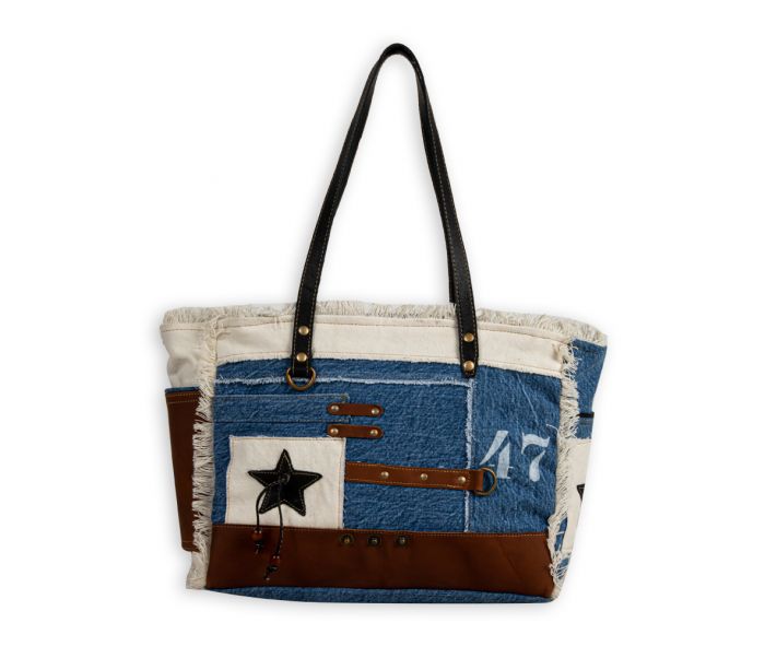 This roomy tote features this collection’s distinctive design elements. The rich blue denim canvas is arranged in patchwork fashion, with charming leather accents, including a sewn star with beads. A rich caramel leather panel graces the front, while gently frayed-edge treatments appear as well. Zipper-close top. The back continues the denim canvas with zippered pocket. Durable leather carrying shoulder straps.