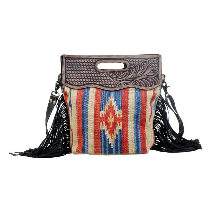 The bright hues on this up-cycled rug make this bag stand out in your wardrobe. It has fringes on both sides which give it a dramatic look. The lovely engraved handle features a rich leather design that is made in high quality. It has a broad black leather adjustable strap that can be removed.
