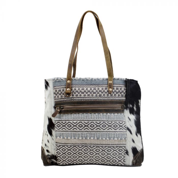 This sophisticated and spacious tote features a lovely neutral aztec patterned rug with sides constructed from black and white hair-on hide. This tote also has zipper closure and a short zipper for quick access on the back of the bag. Stay trendy with this multi-purpose bag.