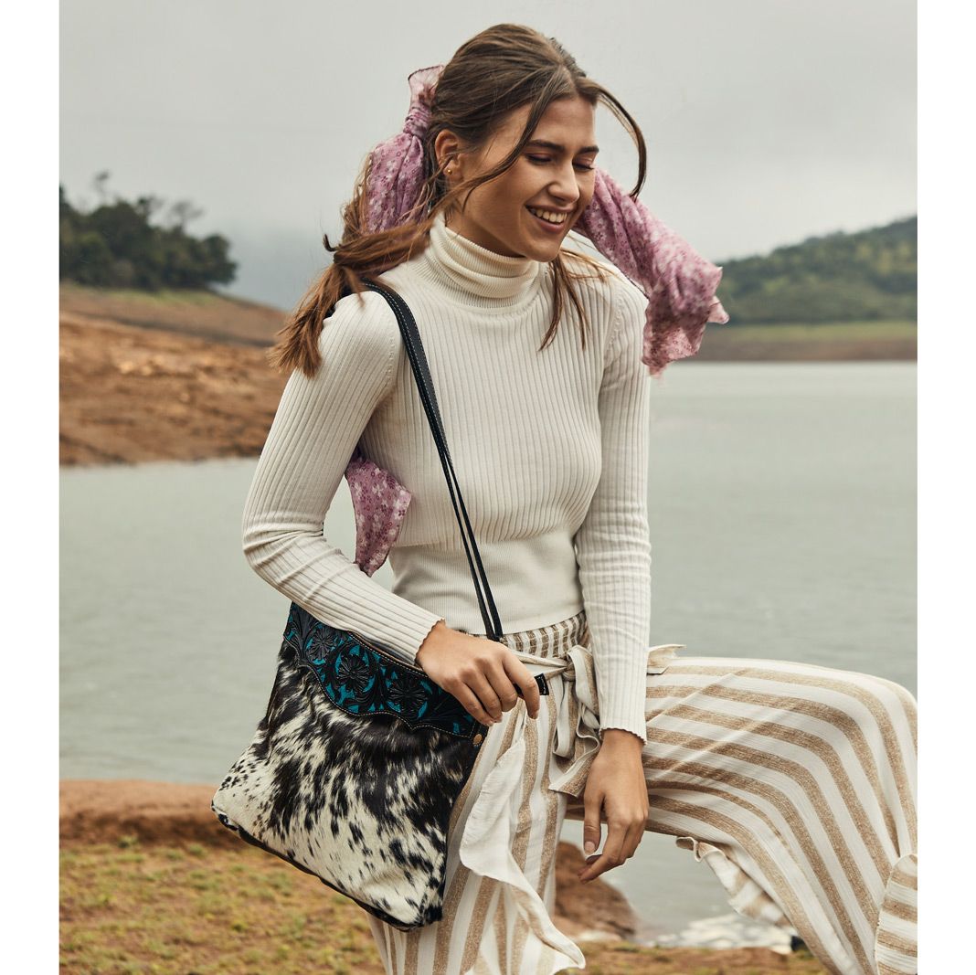 This bag leaves nothing to be desired. A creative focus on construction is presented with every detail. A soft meticulously selected hide with varying patterns of spotted black and white spots throughout the front and backside of this amazing bag. The eye-catching contrast between the bright hand-painted turquoise against the charcoal black embossed leather. A stunning accessory that can be worn daily and functional for casual and easy travel.