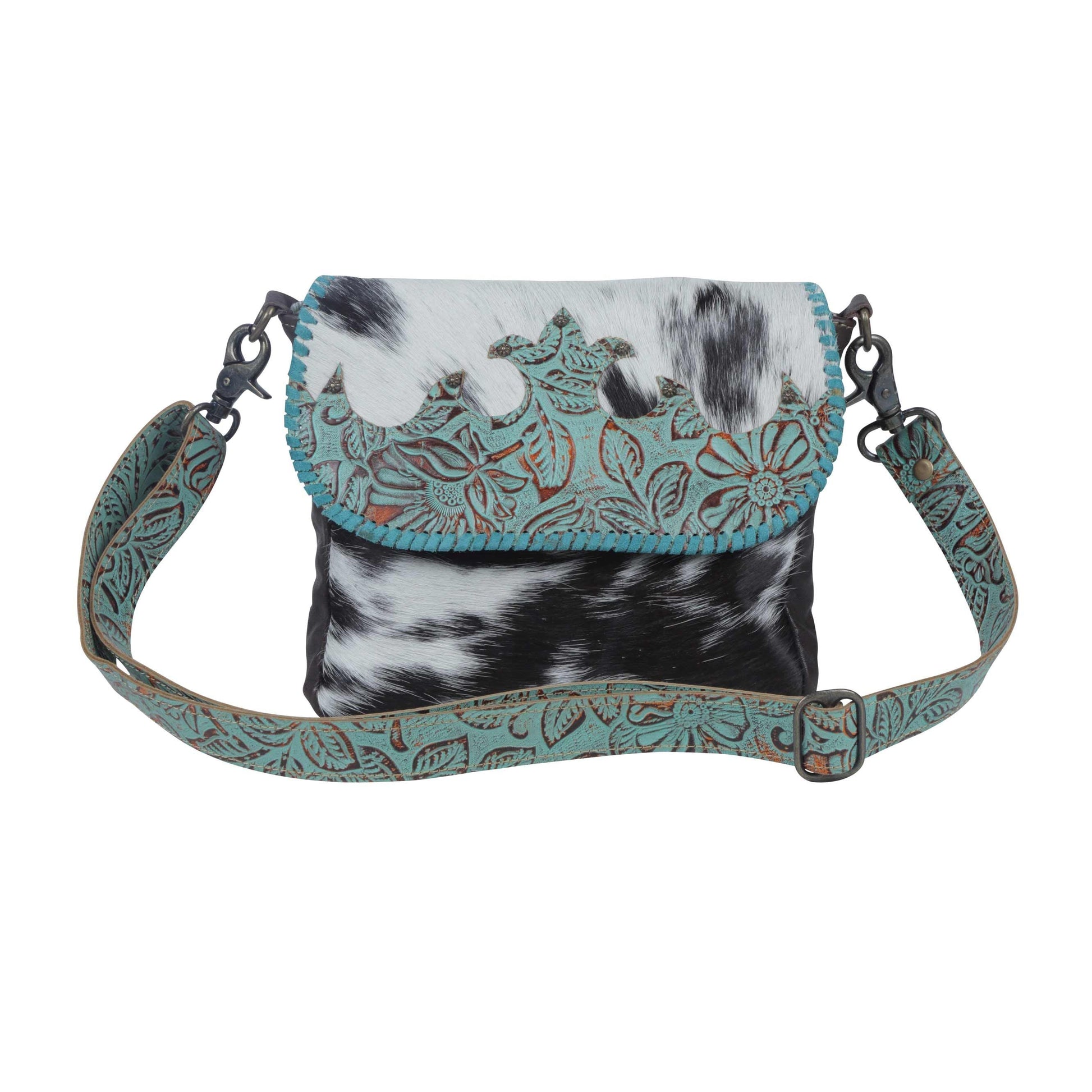 The delicate, turquoise floral pattern in 100% authentic hand tooled leather stands out against the black and white cowhide leather. Zippered top and adjustable leather strap ensure safe and comfortable carrying.