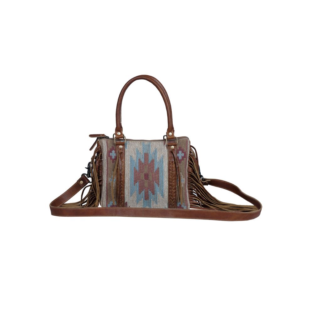 This great handbag features a recycled woven rug piece with a Southwest motif. Braided leather accents grace the front, while a full leather back of polished brown leather compliments the sewn leather handles. Features a zippered compartment on the side , and fringe on both sides.