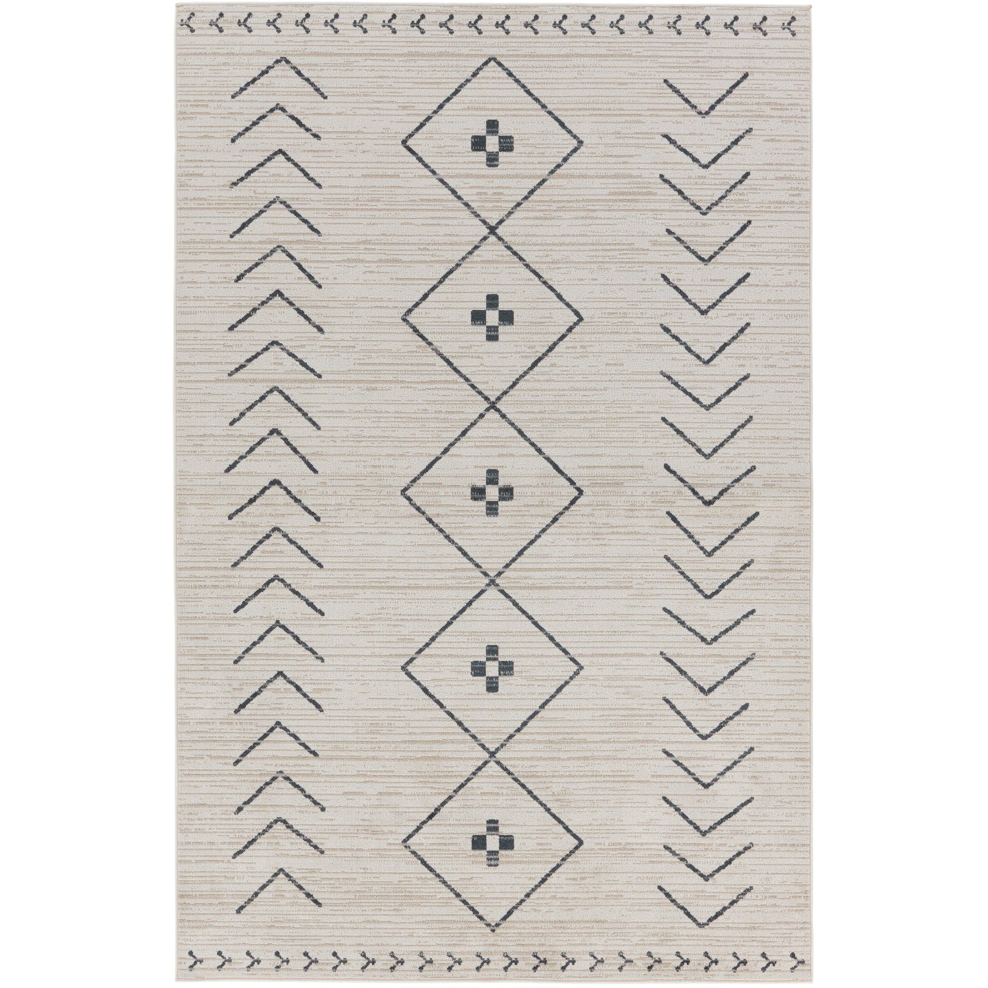 The incredibly chic Nadine collection offers durability and easy-care without compromising one bit on the style. This kid and pet-friendly assortment of rugs features a washable quality and a range of globally inspired designs that anchor rooms with eye-catching appeal. The Taos rug showcases a modern Moroccan pattern in dark slate on a cream and tan striated background. The 100% polyester fibers provide a slight sheen and lasting quality that thrives in high traffic areas of the home such as kitchens, halls, bathrooms, living rooms, and bedrooms.