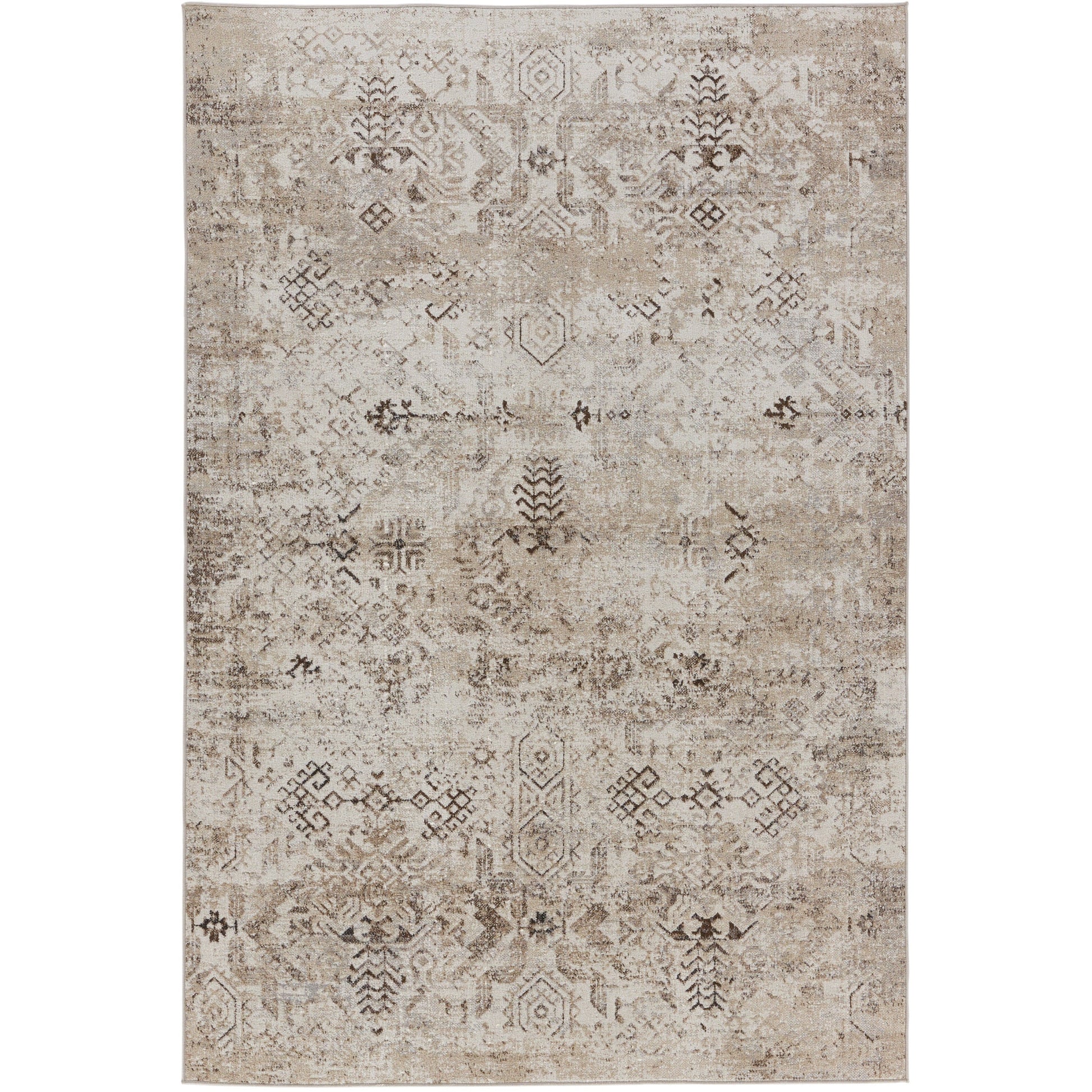 The incredibly chic Nadine collection offers durability and easy-care without compromising one bit on the style. This kid and pet-friendly assortment of rugs features a washable quality and a range of globally inspired designs that anchor rooms with eye-catching appeal. The Kati rug showcases a distressed tribal pattern in brown on a cream, gray, tan, and deep brown striated background. The 100% polyester fibers provide a slight sheen and lasting quality that thrives in high traffic areas of the home such as kitchens, halls, bathrooms, living rooms, and bedrooms.