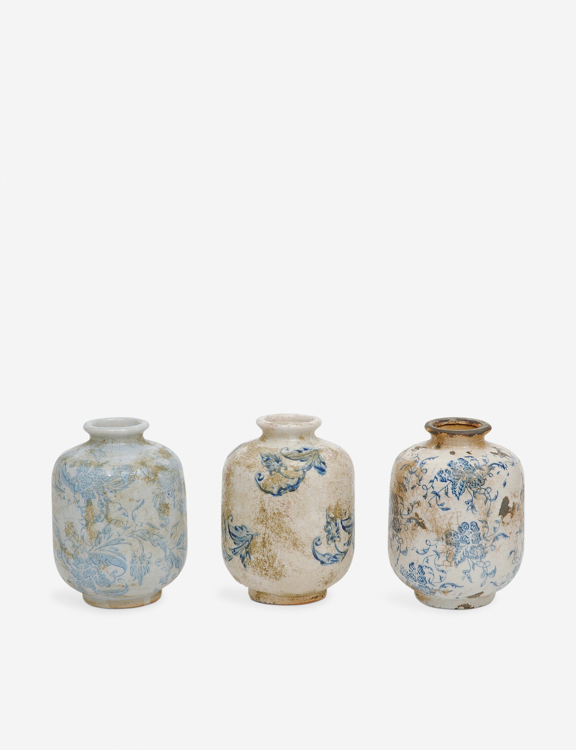 Thoroughly refined with an antiqued finish, these blue and white vases are set for vintage appeal. The three bud vases are the perfect size for displaying a row of single-stem flowers or bringing a variety of local botanicals into your entryway or dining room. We love this set for layering texture into a rustic cottage edit or enriching transitional decor with a seasoned charm.