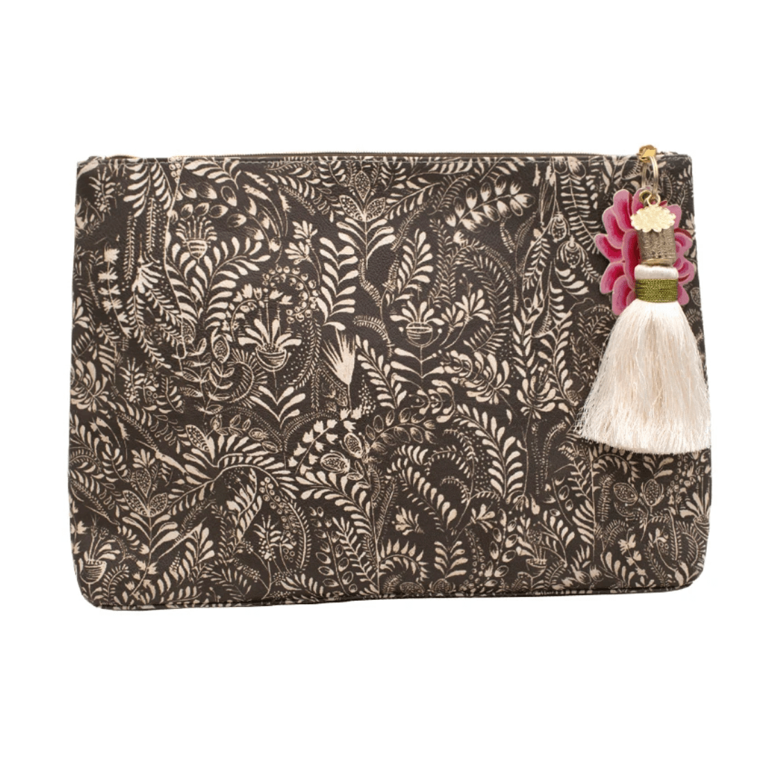 PAPAYA’s Living Woman Tassel Pouches are a vibrant, chic women’s clutch illustrated with delicate leaf brushstrokes on a soft black. Durable enough to use for organizing your beauty products, cosmetics, toiletries, art supplies and overnight must-haves or perfect for a glamorous night out on the town. A unique, boho gift for bridal showers, weddings, office parties, birthdays, Mother's Day and more.