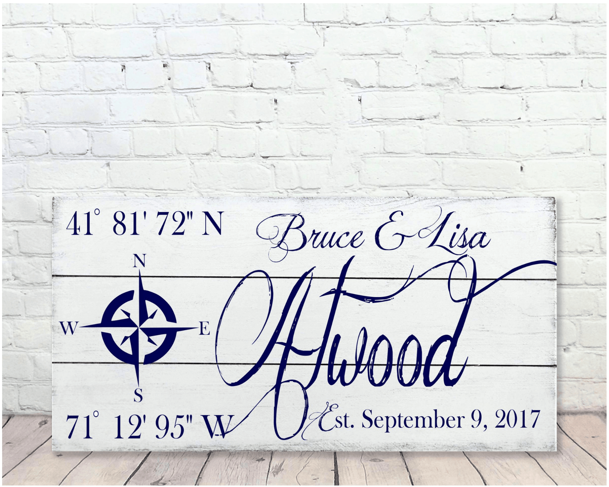 Personalized Name Sign with a Rose Compass and Coordinates This wood sign would made a great wedding gift
