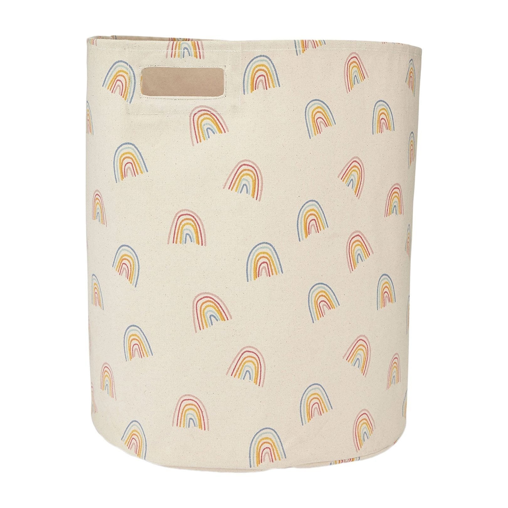 Pehr hampers are designed to hold clothes, mitts, boots, trucks, balls, blocks, swimsuits, beach gear, and everything in between. This hamper with a vibrant colored rainbow print forecasts 100% chance of giggles.