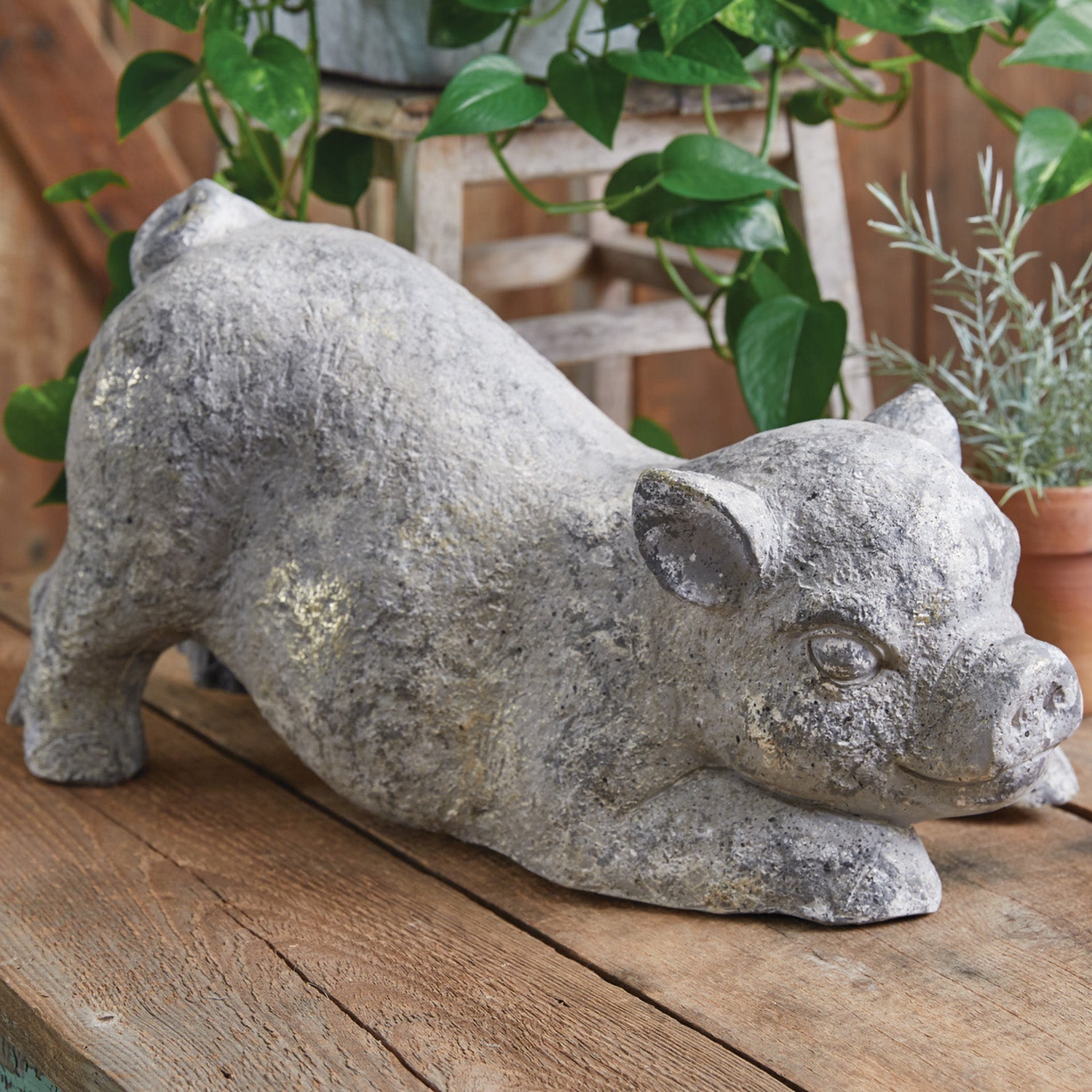Display a little bit of the country in your garden or home with this playful piglet. Its adorable pose and details will give a delight to anyone who sees it. Item is fashioned of resin with a metallic finish.