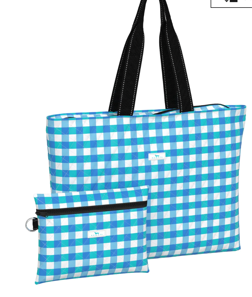 - Two bags in one: tote folds into zipper pouch; zipper pouch snaps inside tote to become pocket