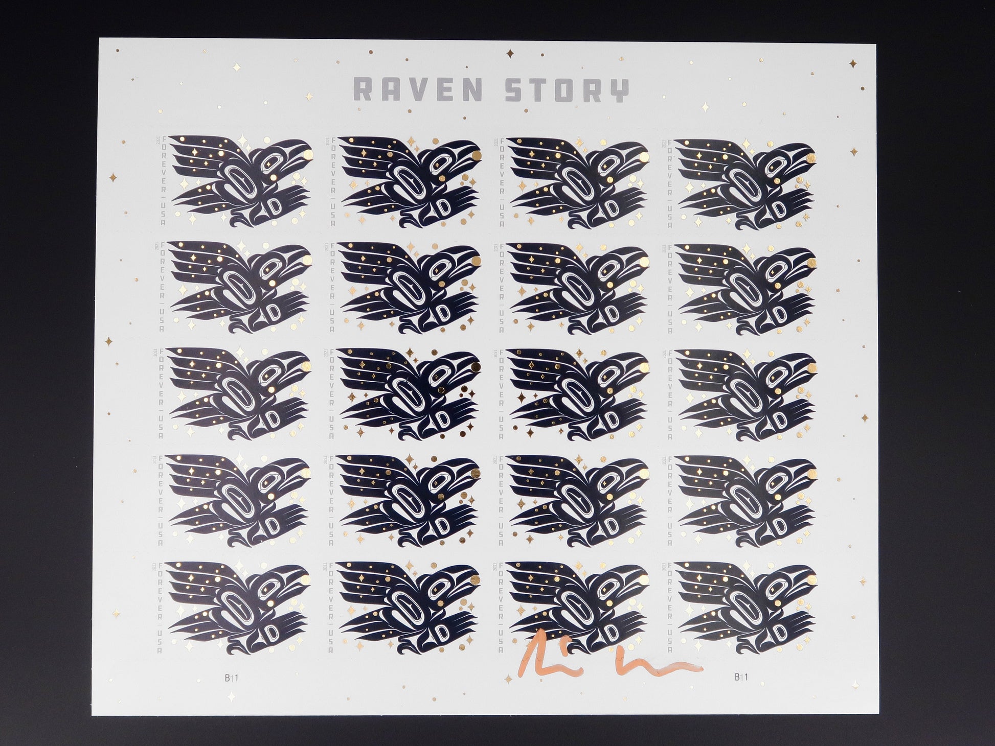 Merging traditional artwork with modern design touches, this stamp depicts one of many stories about Raven, a figure of great significance to the Indigenous people of the Pacific Northwest Coast, part of the area that ranges from Southeast Alaska through coastal British Columbia and south into Washington state.
