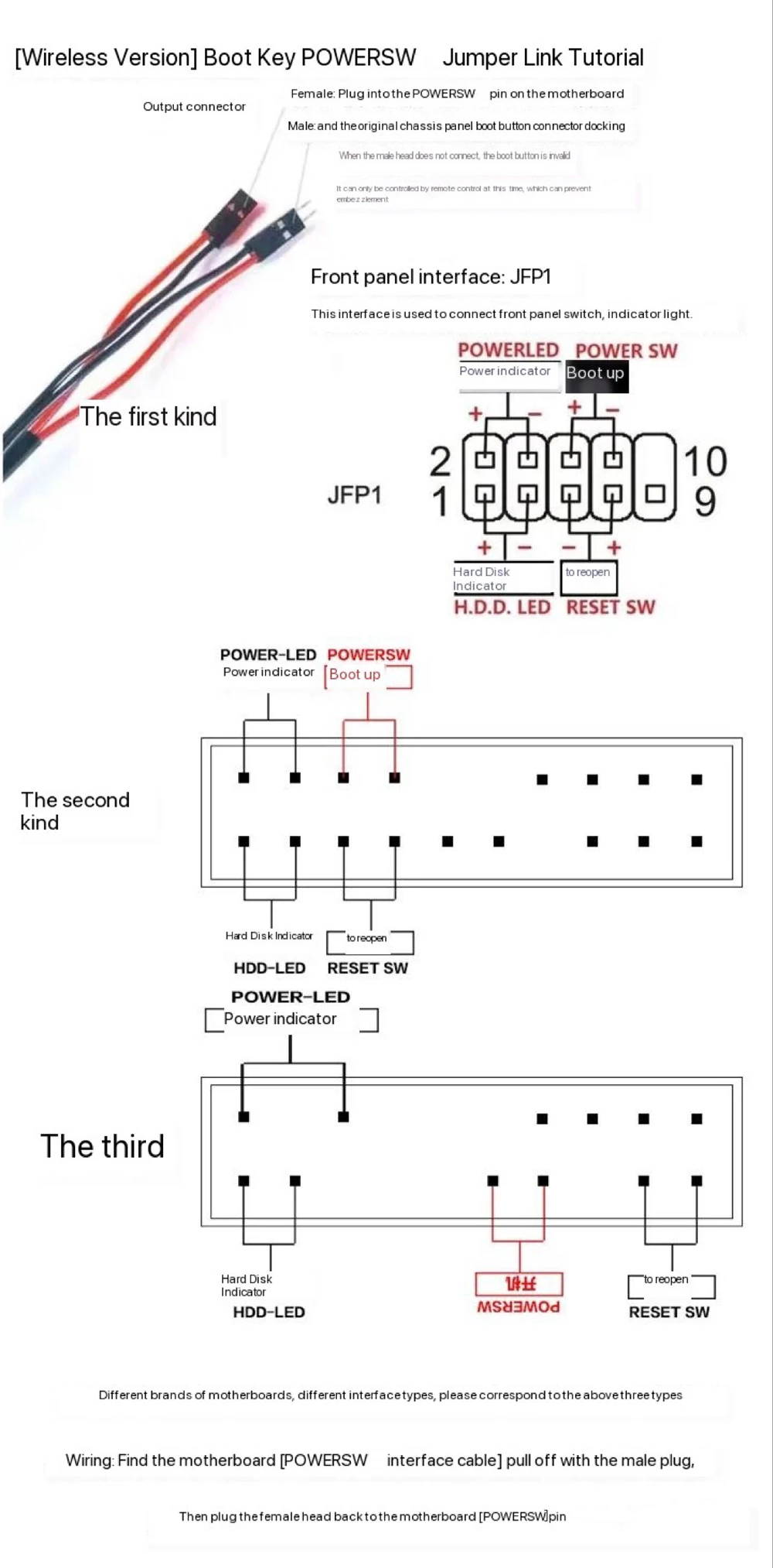 Step 1: Link the POWERSW power jumper. (different interfaces on diffetent motherboards)