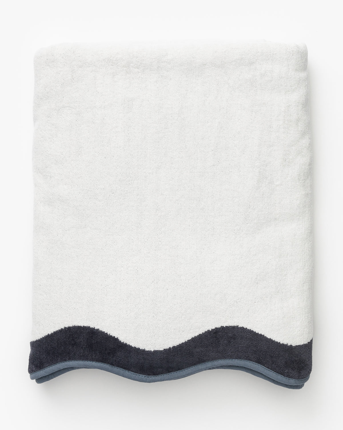 Made from the highest quality cotton, the Riviera White Beach Towel has a timelessly elegant design in a simple motif. The antique white towel has a navy scalloped border, providing both form and function to your poolside accessories.