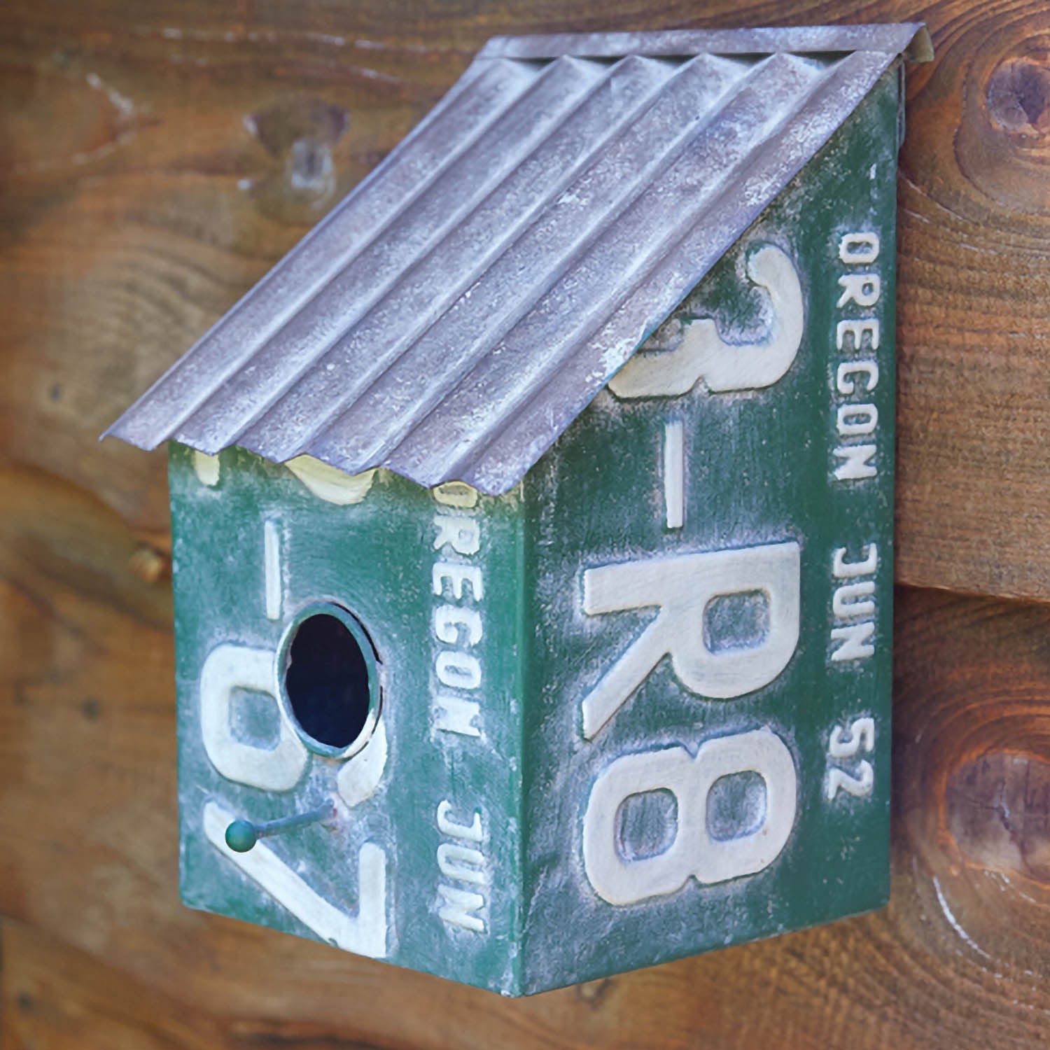 Provide your feathery friends with a fun, wanderlust-inspired place to call home. This birdhouse looks like it was repurposed from found vintage license plates. Item features a hinged door for easy cleanout. To hang, use its two keyhole hangers.