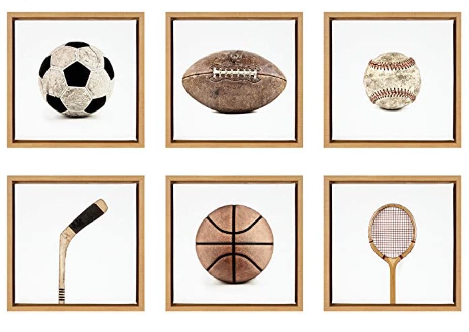 TRANSITIONAL CANVAS WALL ART: Sporty art on framed gallery-wrapped canvas. Print name: "Soccer Ball on White," "Football on White," "Baseball on White," "Hockey Stick on White," "Basketball on White," "Tennis Racket on White" by Shawn St. Peter