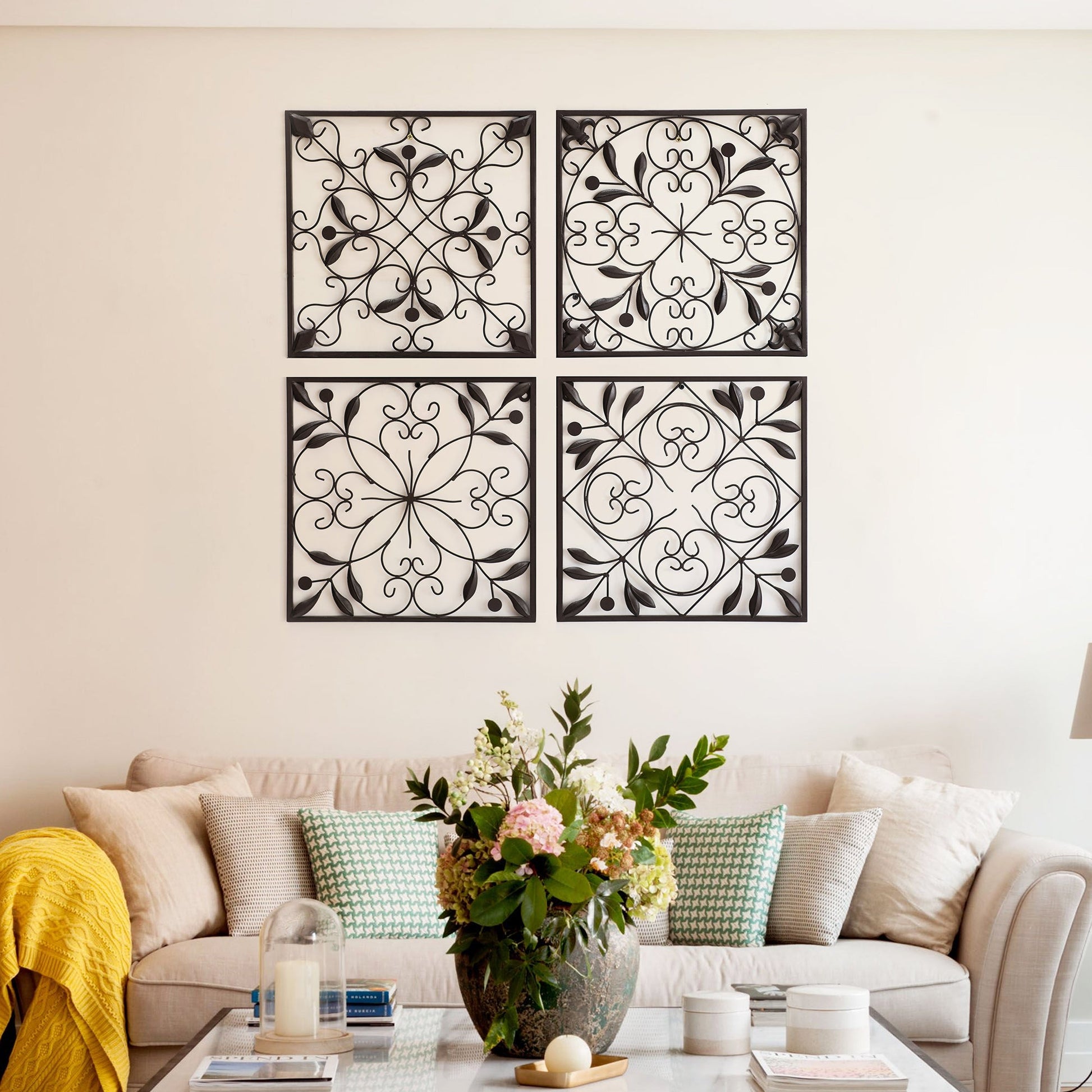 - Stylish Design: This 4-panel wall decor is made of iron for a solid and sturdy structure with a deep brown/bronze finish, and the 4 square coordinating pieces are adorned with scallops and scrolls that make them a perfect addition to any antique or traditional style decor.