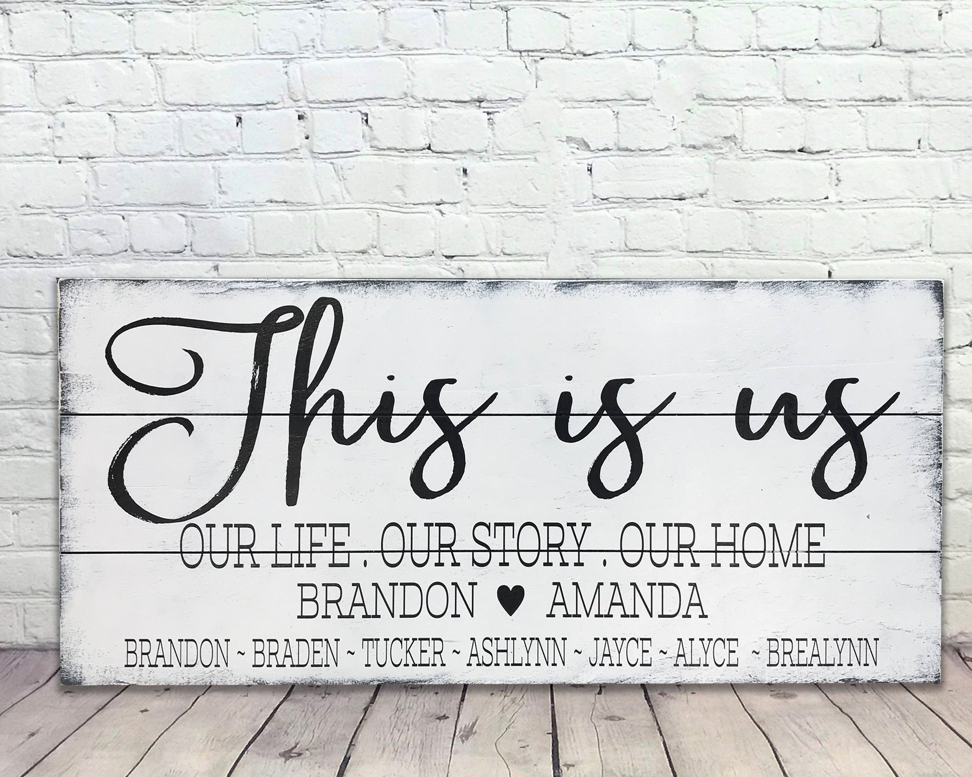 This Is Us - Our Life. Our Story. Our Home. This personalized wood sign would look great on a family photo wall.