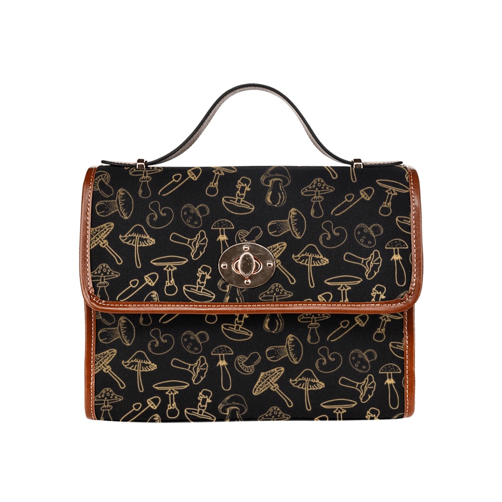 Design: mushrooms The design is printed on all sides. The handle and trim are brown. The shoulder strap is brown with adjustable length.