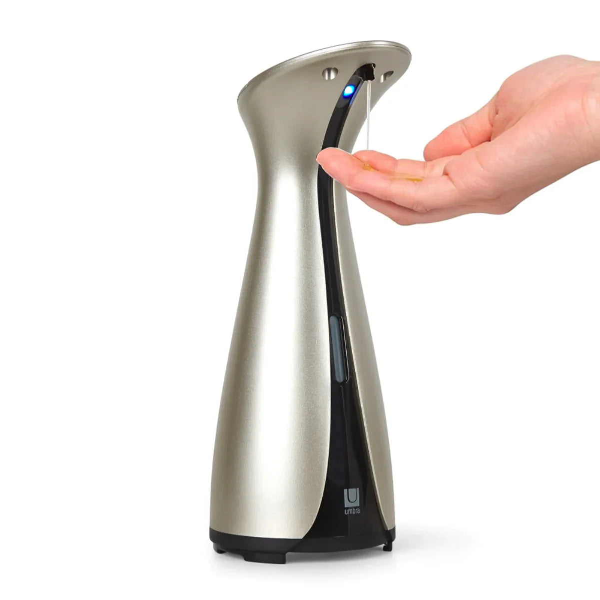 the umbra otto sensor soap dispenser is a hands-free operation, featuring a built-in sensor, which detects movement and instantly dispenses a fixed amount of 0.07 oz. (2ml) of soap.