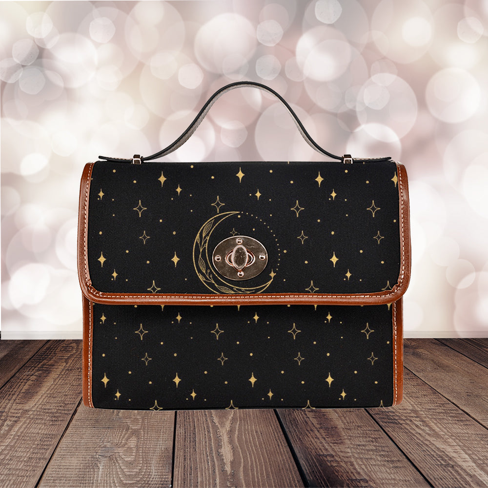 Witchy black handbag / shoulder bag in black with brown vegan leather trim and golden moon and diamond shaped sparkle symbols. This purse is great for bringing a little magic into your every day.
