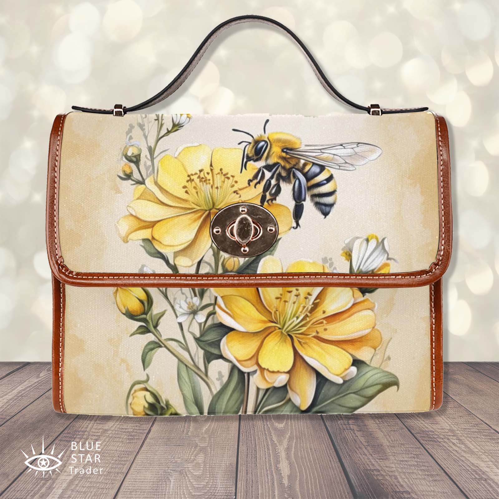 The stunning bag features an artistic illustration of a honey bee visiting and collecting pollen from some beautiful yellow flowers. This handbag is a great accessory for any outfit.